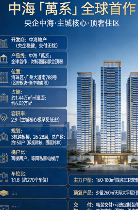 正在广州这座千年商都的邦畿上,每一次城市封面的更迭,都伴跟着一个传奇项目标降生。当光阴的指针拨向 2026 年,广州楼市的聚光灯毫无保留地汇聚正在海珠新中轴的璀璨节点。这里,是珠江新城向南延长的黄金动脉,是广州塔脚下最初一片未被完全开辟的低密膏壤。就正在这一片承载着无数老广回忆取新贵胡想的地盘上,央企中海以“萬系”顶豪之姿,沉磅呈献其全球首做——中海广府万宸。这不只仅是一处居所,更是一张通往广州顶层糊口圈层的入场券,是一次对城市改善栖身尺度的从头定义。